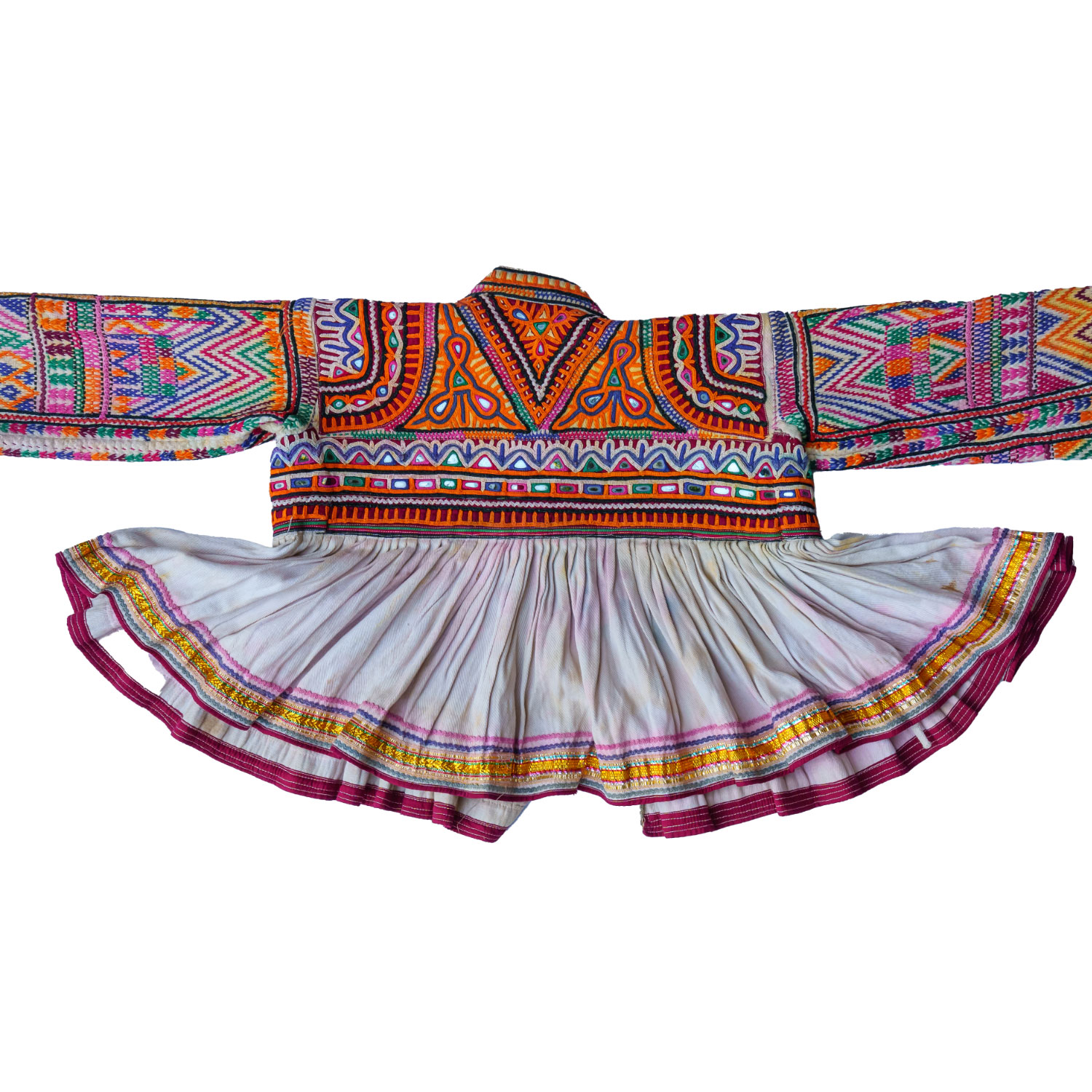 Embroidered with silk and cotton threads on a cotton base; embellished with mirrors.