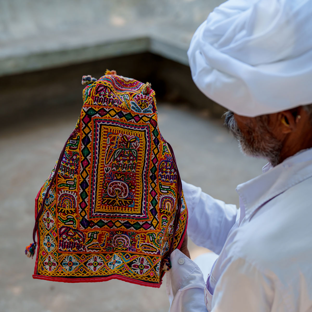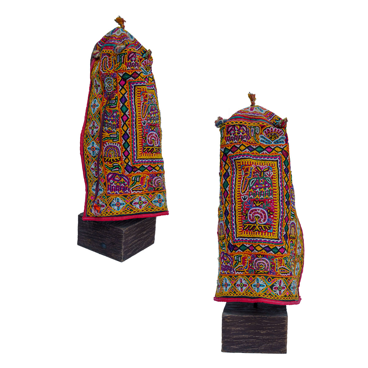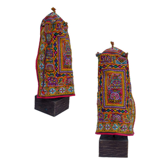 The Toplo is an intricately embroidered cap made for infants by mothers in the Kanabi Patel community of Kutch, Gujarat. Created with devotion and care, it is traditionally gifted to a child during the sixth-day naming ceremony, symbolizing both protection and maternal affection. Rich in emotional and cultural significance, this particular Toplo—now 50–60 years old—has been remarkably preserved in excellent condition.