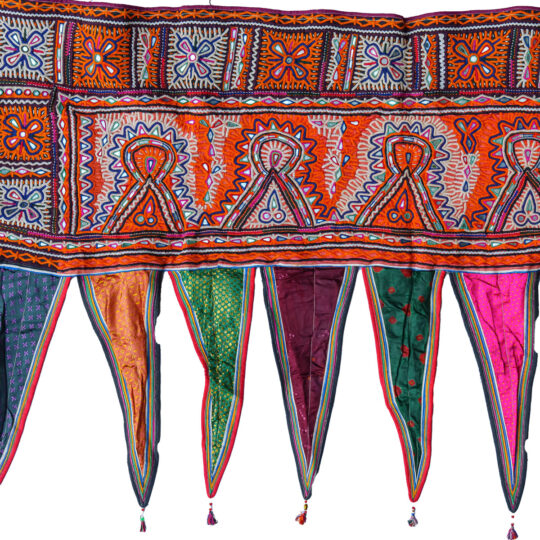 This hand-embroidered door hanging is crafted by the Dhebariya Rabari women of Kutch, Gujarat—renowned for their bold and intricate textile artistry. Traditionally hung above doorways, such pieces are not merely decorative but serve as protective symbols, believed to invite prosperity and ward off negative energies.