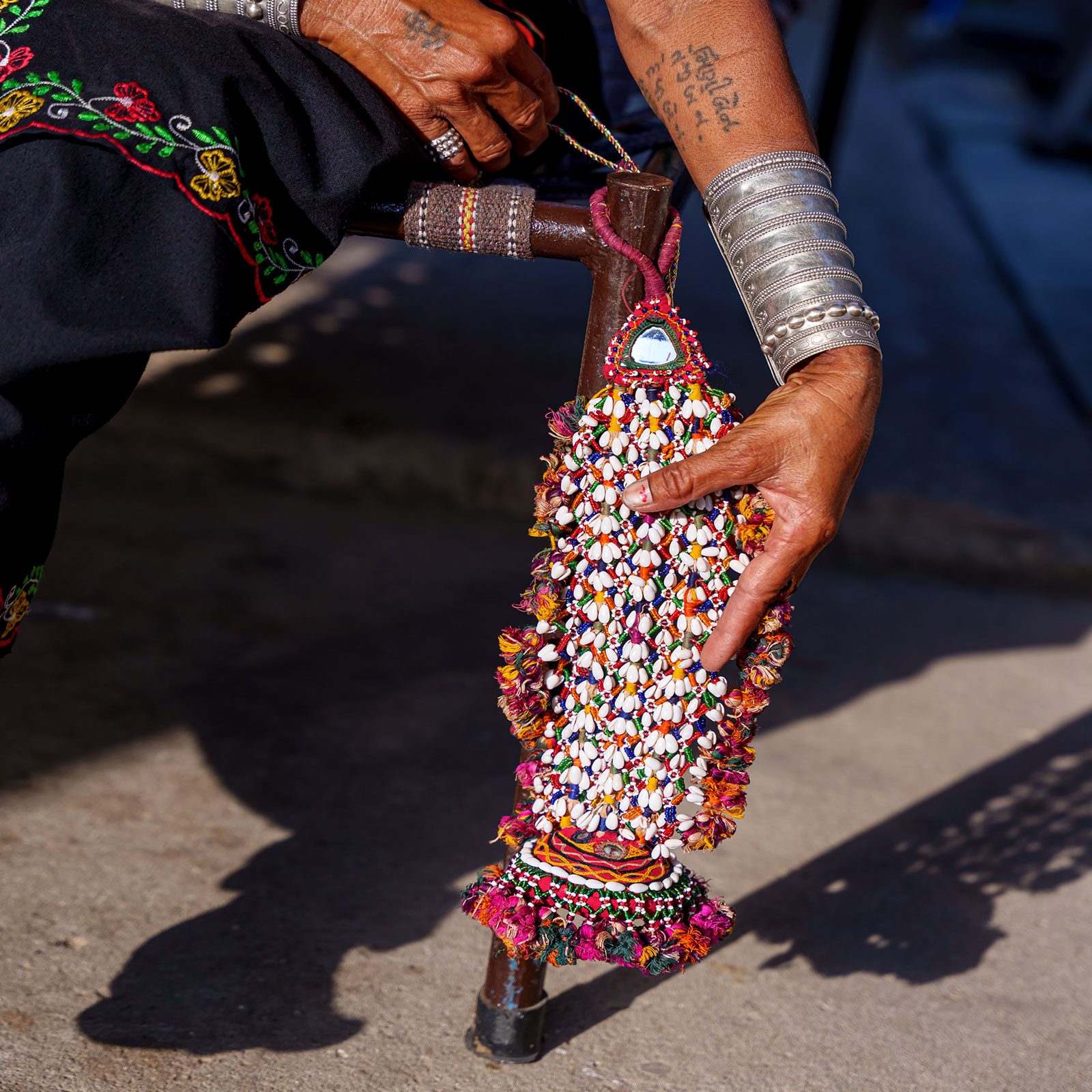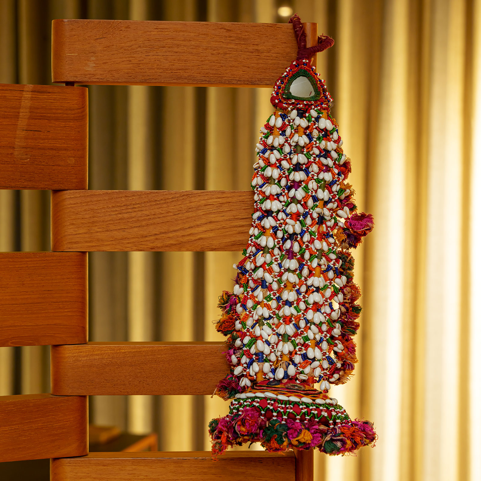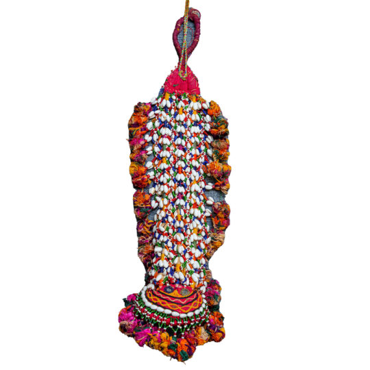 A charming handmade hanging crafted by Rabari women in Kutch—a delicate mobile woven from soft cotton thread, enhanced with sparkling mirrors and beadwork—designed to gently sway above a baby’s crib. Symbolic—carries both aesthetic warmth and cultural guardianship, believed to ward off negative energies and bring blessings to the child.