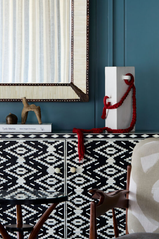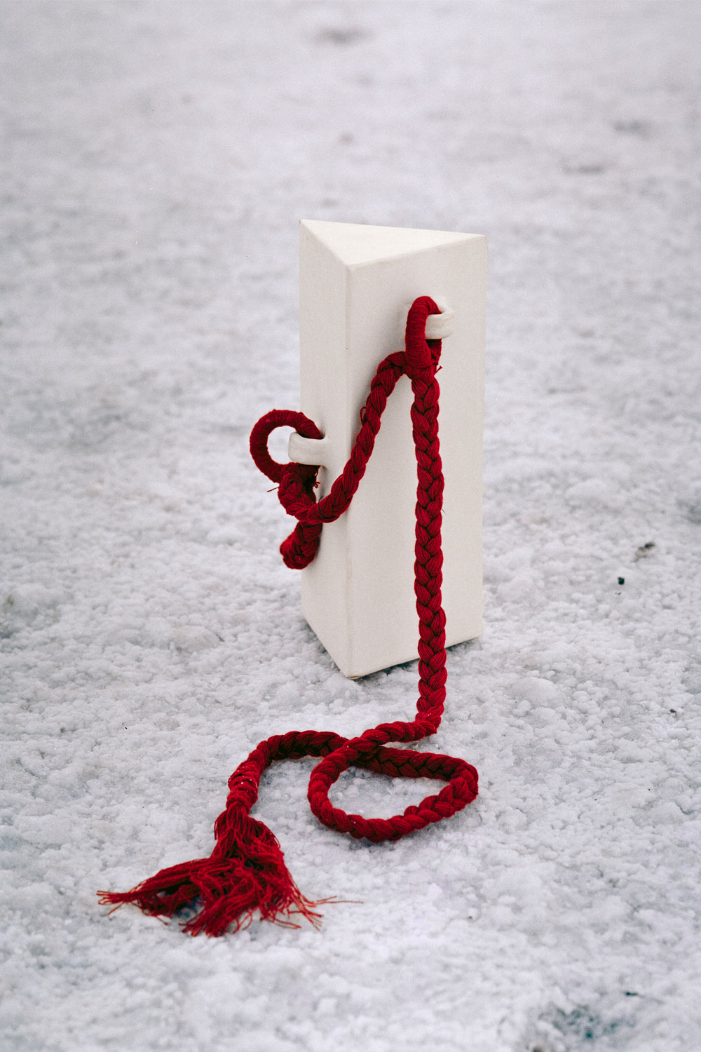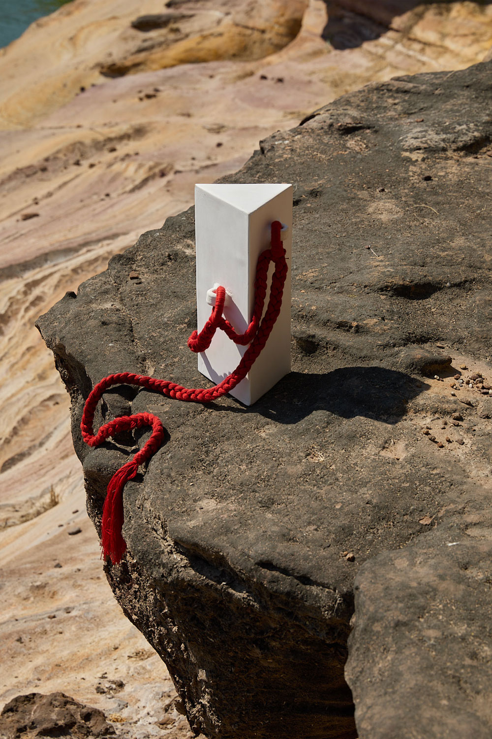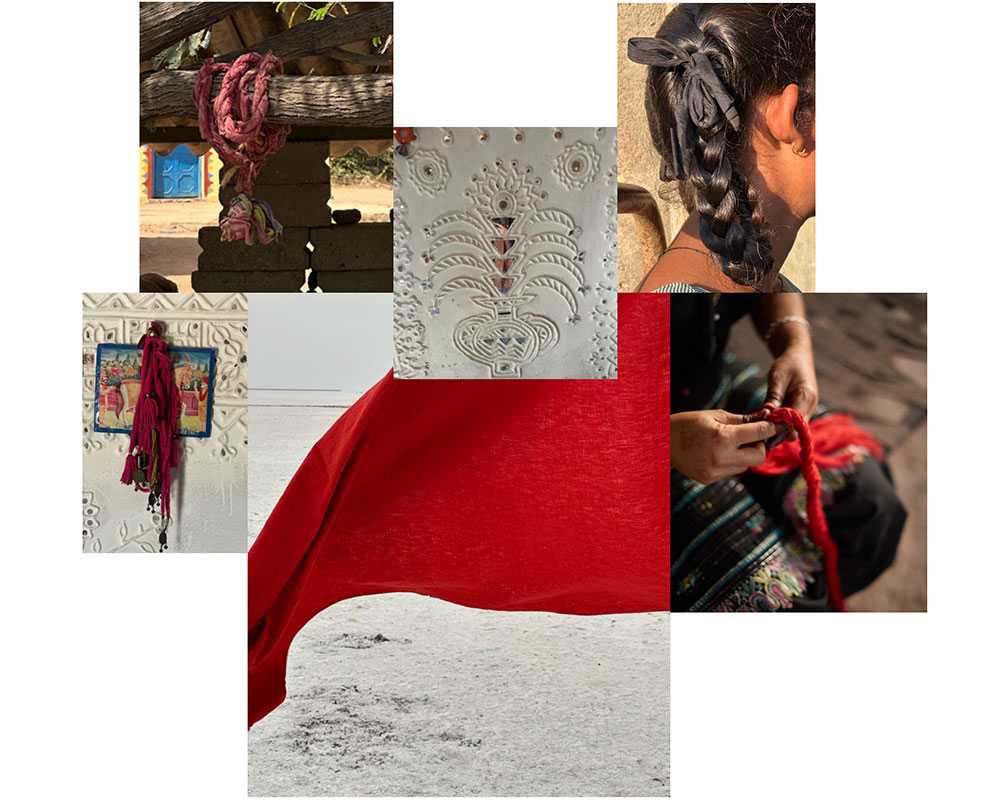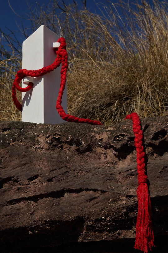 There’s a series of geometric linearity across Kutch—from clean-lined houses and their door frames to glyph-like patterns painted on a camel’s body. In contrast, the textiles and ornaments worn by its people or weaving through the plaits on young girls display a playful mix of vibrant hues. White clay from the banks of the Khari Nadi juxtaposes the stark purity of the White Desert Of Kutch against celebratory tones of the region in ‘The Hut’, its three-faced rigid body softened with a braided crimson cotton rope sinuously draped around it.